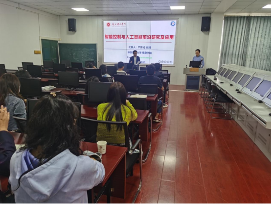 严怀成教授以“智能控制与人工智能前沿研究及应用”为主题做学术讲座,他首先介绍了智能控制和人工智能的最新研究进展,在此基础上重点分享了其在无人车、机器人、大数据分析处理方面的相关实际应用成果。最后,与会人员就智能驾驶、边缘计算等进行了深入讨论,并就学院的科研团队建设进行了交流、指导。