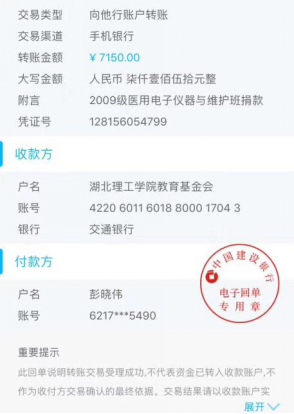 2009级医用电子仪器和维护班共有员工26人,其中班长惠辉在武汉新型冠状病毒肺炎疫情爆发以来,时刻关注武汉局势的发展变化。在听到志愿湖北医疗队的消息后,他积极主动报名,但因为单位被定为新冠肺炎定点医院而没有成行。之后他通过班级微信群发起捐款倡议,同学们在收到倡议书之后纷纷慷慨解囊,积极为母校贡献自己的绵薄之力,最终26名同学共筹集到7150元。随后他主动联系班主任胡增裕老师咨询捐款具体流程,并由彭晓伟负责转账,希望以微薄之力,助力学校疫情防控工作。